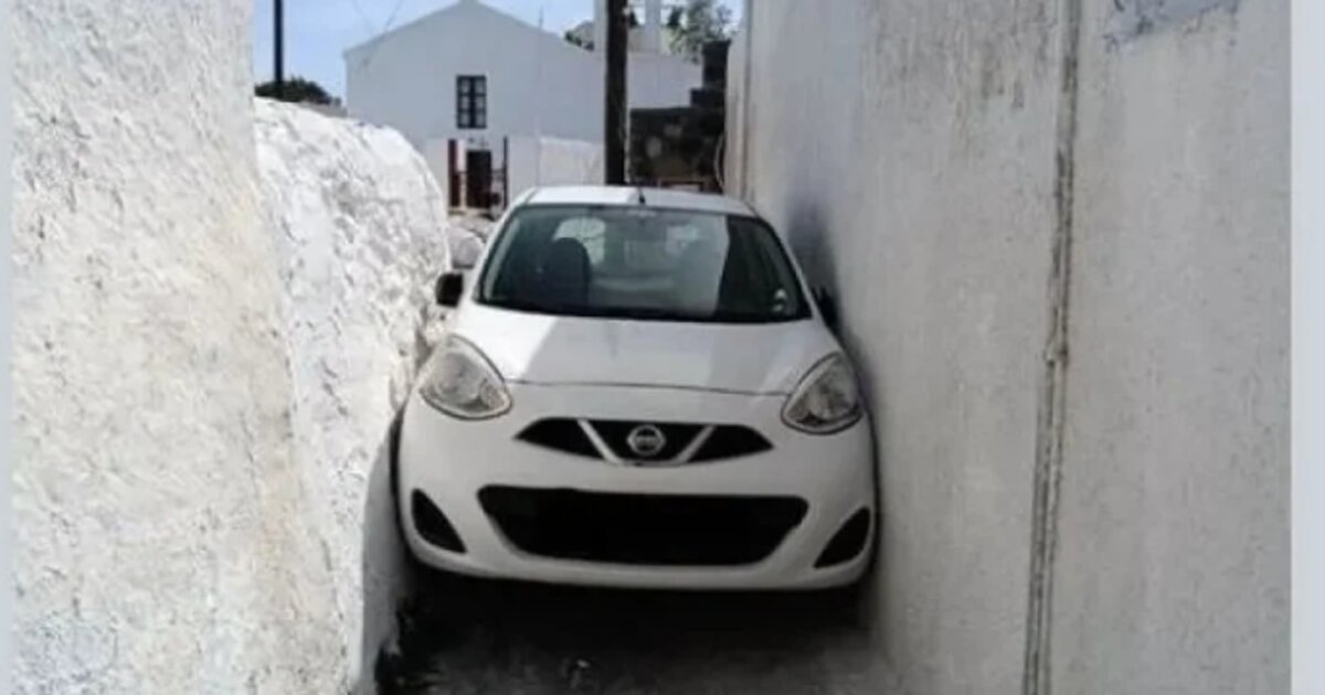 Ένα απίστευτο συμβάν έλαβε χώρα σε χωριό της Σαντορίνης, όπου ο οδηγός ενός ενοικιαζόμενου αυτοκινήτου κατάφερε, γιατί περί... κατορθώματος πρόκειται, να το σφηνώσει σε σοκάκι!