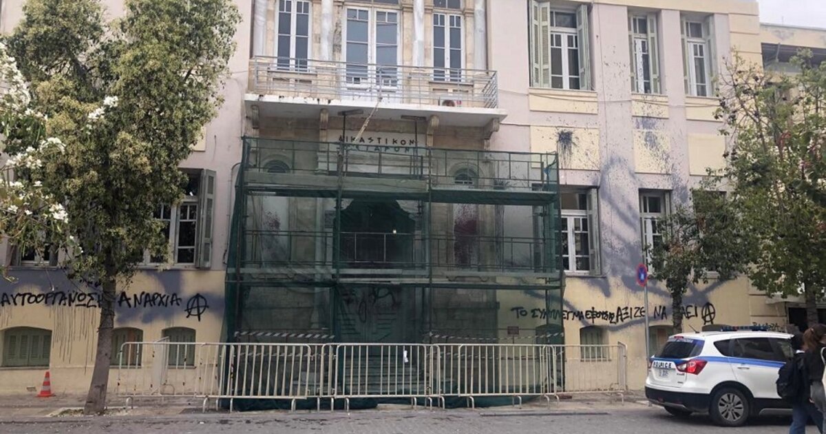 Εντατικές εργασίες καθαρισμού και αποκατάστασης των φθορών ξεκίνησαν στον εξωτερικό χώρο του δικαστικού μεγάρου Ηρακλείου όπου στήθηκαν σκαλωσιές.