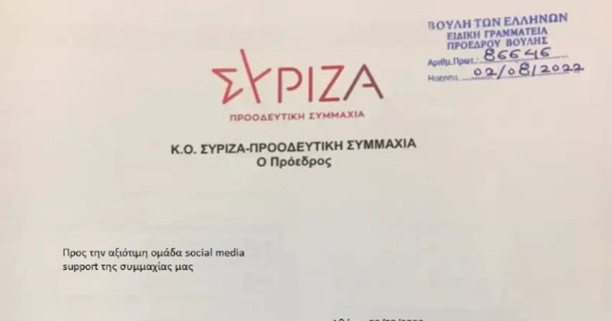 Ειδικότερα, στα social media διακινείται πλαστό έγγραφο με την υπογραφή του Αλέξη Τσίπρα, το λογότυπο του ΣΥΡΙΖΑ-ΠΣ αλλά και σφραγίδα από τη Βουλή των Ελλήνων που περιλαμβάνει άθλιες οδηγίες για τον τρόπο παρουσίασης των γυναικοκτονιών που έχουν συγκλονίσει τις τελευταίες ημέρες τη χώρα μας.