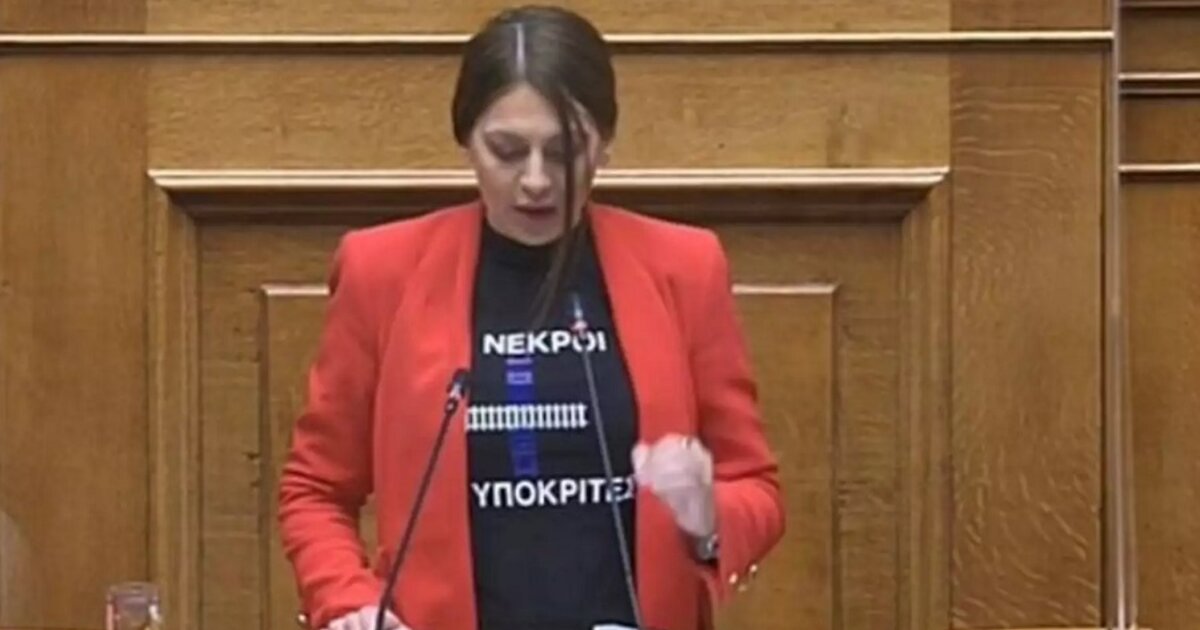Στο βήμα της βουλής με μπλουζάκι για τα Τέμπη η Μαρία Απατζίδη