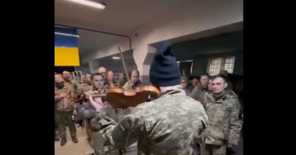 Στο βίντεο φαίνεται ένας στρατιώτης να παίζει με το βιολί του τον εθνικό ύμνο της Ουκρανίας, ενώ βρίσκεται μαζί με τους συναδέλφους στο θάλαμο της μονάδας του.