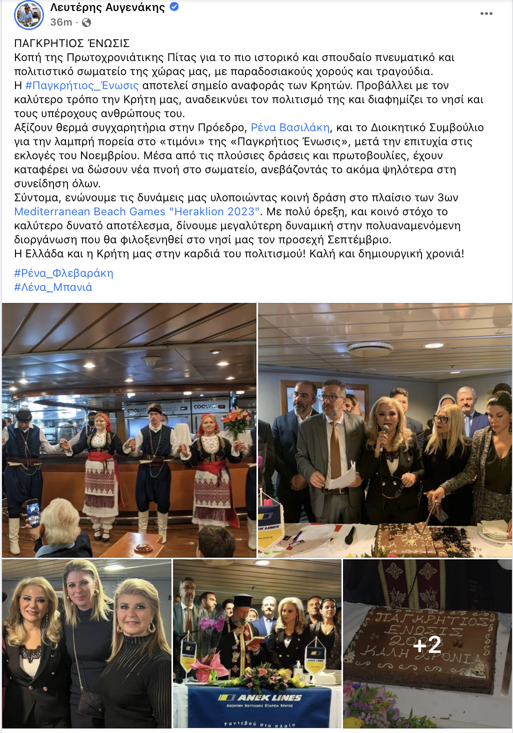 Το έργο της Προέδρου, Ρένας Βασιλάκη, και της Διοίκησης της Παγκρητίου Ενώσεως εξήρε ο Υφυπουργός Πολιτισμού και Αθλητισμού - Βουλευτής Ηρακλείου, Λευτέρης Αυγενάκης, με ανάρτησή του στα μέσα κοινωνικής δικτύωσης, ο οποίος εκπροσωπήθηκε στην κοπή της Πρωτοχρονιάτικης Πίτας από τη σύζυγό του, Έλενα Μπανιά.