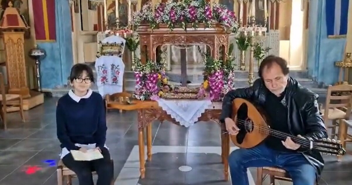 Η μικρή Νικολέττα, κόρη του γνωστού Κρητικού Καλλιτέχνη Βαγγέλη Πυθαρούλη, έψαλε με μοναδικό τρόπο τα εγκώμια πλάι στον στολισμένο Επιτάφιο υπό τους μουσικούς ήχους του λαούτου, συνοδεία του πατέρα της.