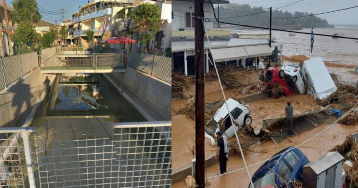 Στις φωτογραφίες του Vlachakis Nikos, φαίνεται το αντιπλημμυρικό έργο με τα κάγκελα, μέσα στο οποίο βρήκε τραγικό θάνατο ο άτυχος Κώστας Βεργάκης, πριν το πέρασμα της φονικής κακοκαιρίας, και μετά...