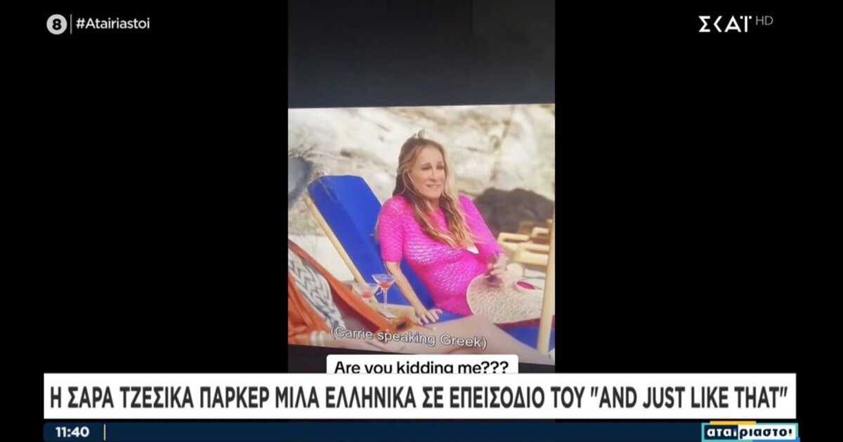 Η «Κάρι» φαίνεται σε απόσπασμα από επεισόδιο του «And Just Like That» να βρίσκεται σε κάποια παραλία της Ελλάδας και ξαπλωμένη σε μια ξαπλώστρα να προσπαθεί να παραγγείλει στον σερβιτόρο δύο κοκτέιλ, μιλώντας ελληνικά.