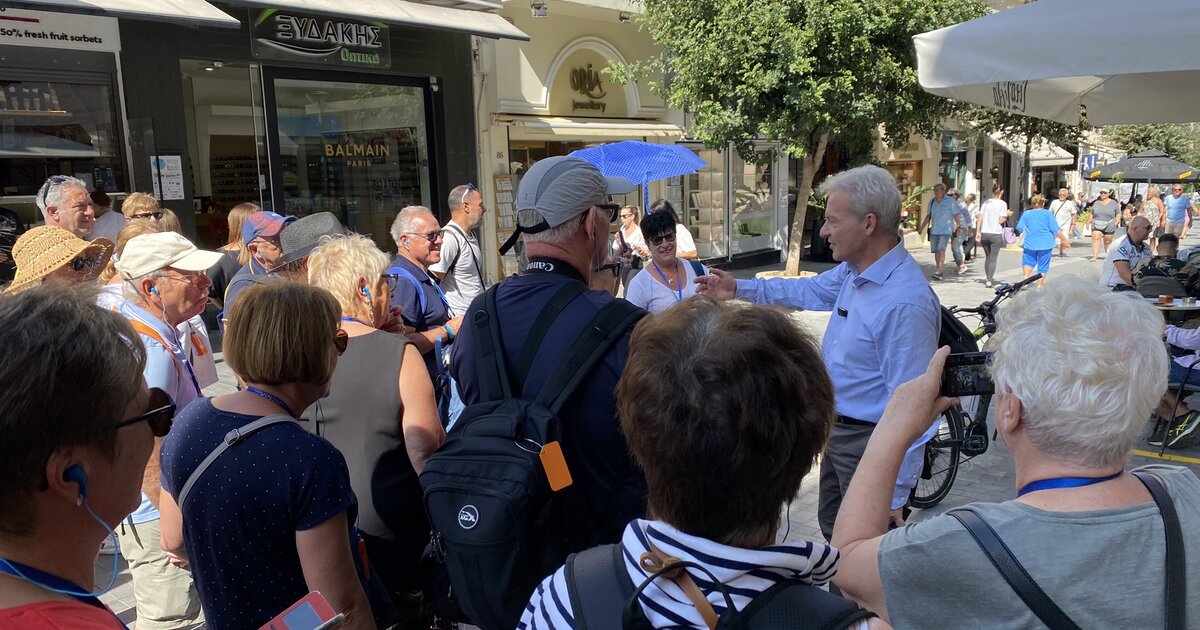 Κατηφορίζοντας την 25ης Αυγούστου, τον σταμάτησε έξω από τη Λότζια ένα γκρουπ τουριστών από τη Γαλλία, με την ξεναγό να εξηγεί στους ξένους επισκέπτες ότι μπροστά τους έχουν το νέο δήμαρχο της πόλης.