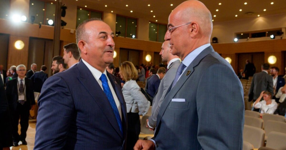FM @NikosDendias had a brief social encounter with #Turkey FM @MevlutCavusoglu on the margins of tdy's #BSF2022