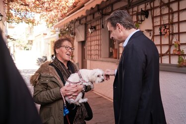 Το ίδιο και η ηλικιωμένη με το σκυλάκι που τράβηξε το βλέμμα του Πρωθυπουργού, ο οποίος σταμάτησε και αντάλλαξε μαζί της δύο κουβέντες.