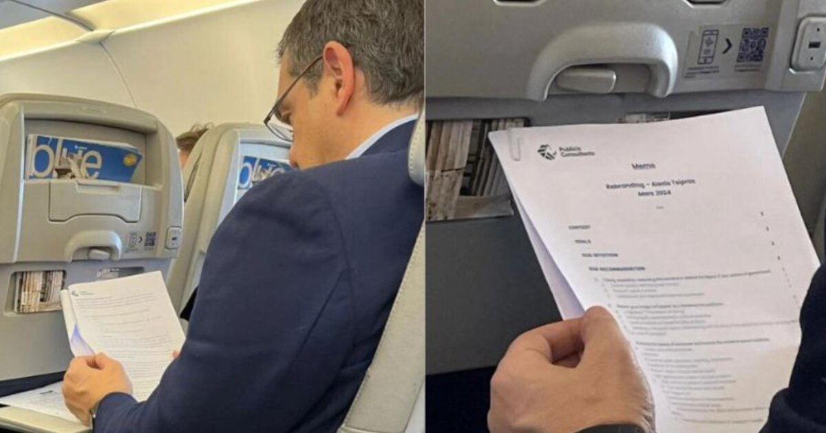 Από τη φωτογραφία που κυκλοφόρησε, ο πρώην πρωθυπουργός, ο οποίος ειρήσθω εν παρόδω ταξίδεψε σε οικονομική θέση, φαίνεται πως μελετούσε ένα ενημερωτικό φυλλάδιο μιας από τις μεγαλύτερες διαφημιστικές εταιρείες στον κόσμο, με έδρα το Παρίσι, της Publicis Communications, με τίτλο «Rebranding - Alexis Tsipras». Από κάτω γράφει «Mars 2024» (Μάρτιος 2024).
