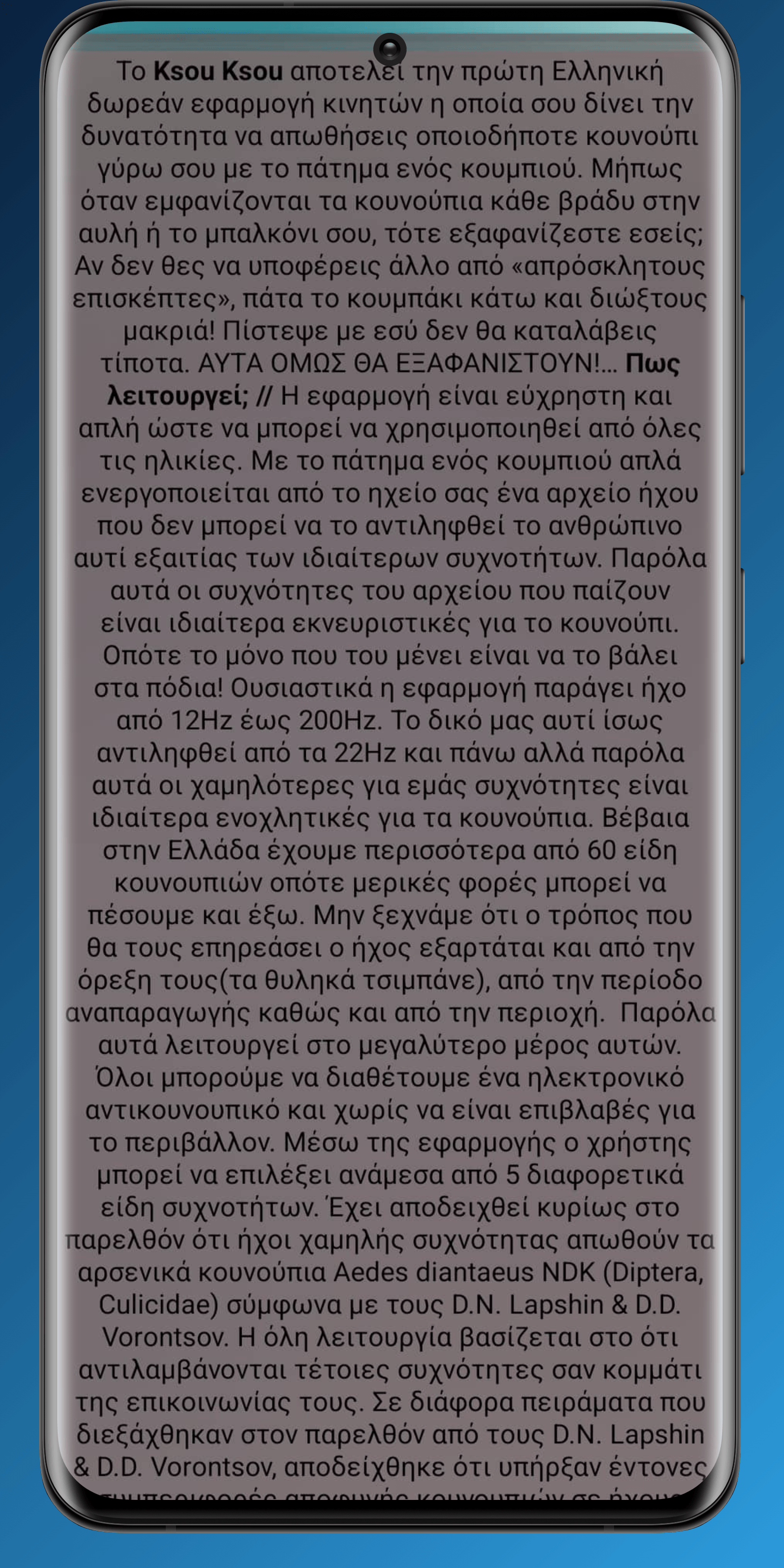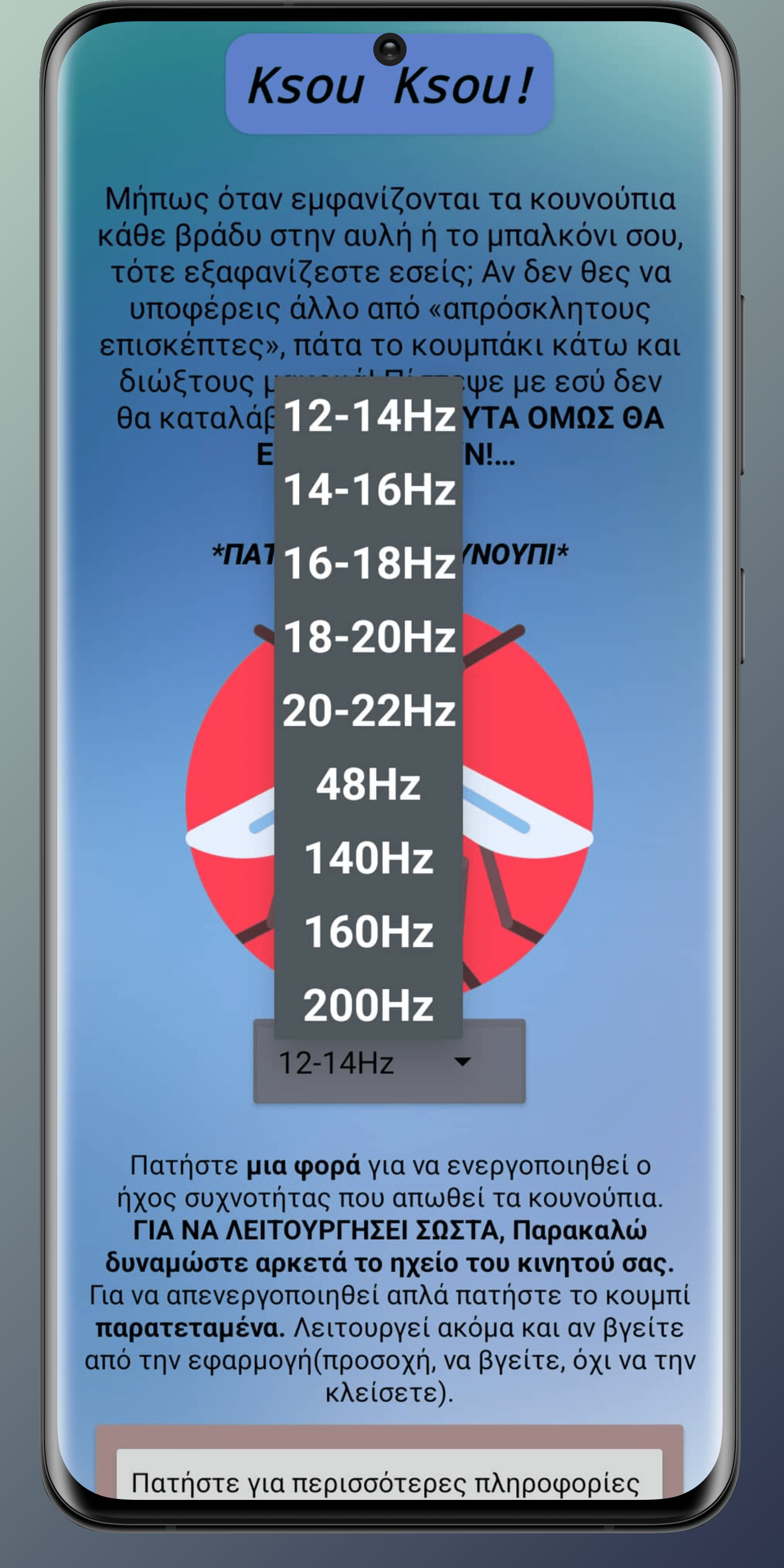 "Το Ksou Ksou αποτελεί την πρώτη Ελληνική δωρεάν εφαρμογή κινητών η οποία σου δίνει την δυνατότητα να απωθήσεις οποιοδήποτε κουνούπι γύρω σου με το πάτημα ενός κουμπιού. Μήπως όταν εμφανίζονται τα κουνούπια κάθε βράδυ στην αυλή ή το μπαλκόνι σου, τότε εξαφανίζεστε εσείς; Αν δεν θες να υποφέρεις άλλο από «απρόσκλητους επισκέπτες», πάτα το κουμπάκι κάτω και διώξε τους μακριά! Εσύ δεν θα καταλάβεις τίποτα. ΑΥΤΑ ΟΜΩΣ ΘΑ ΕΞΑΦΑΝΙΣΤΟΥΝ!…"