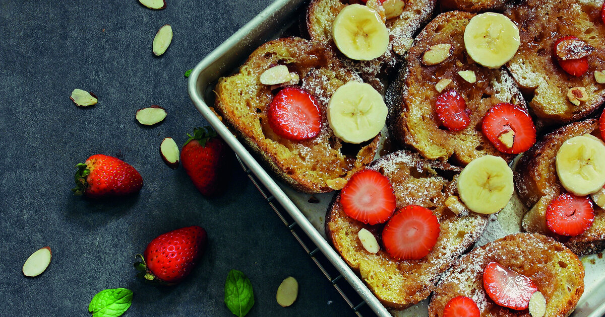 8 φέτες από τσουρέκι 1½ φλιτζ. φρέσκο γάλα 2 αβγά 3-4 κουταλιές της σούπας μέλι ½ κουταλάκι του γλυκού κανέλα σκόνη Ελαιόλαδο για το τηγάνι Φράουλες & μπανάνες για το σερβίρισμα
