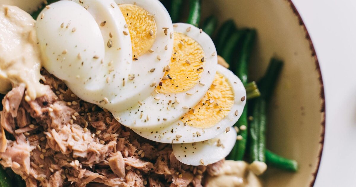 Από πάνω προσθέτετε τον τόνο σε κομμάτια και τα βραστά αυγά. Τελειώνετε με λίγο φρεσκοτριμμένο πιπέρι.