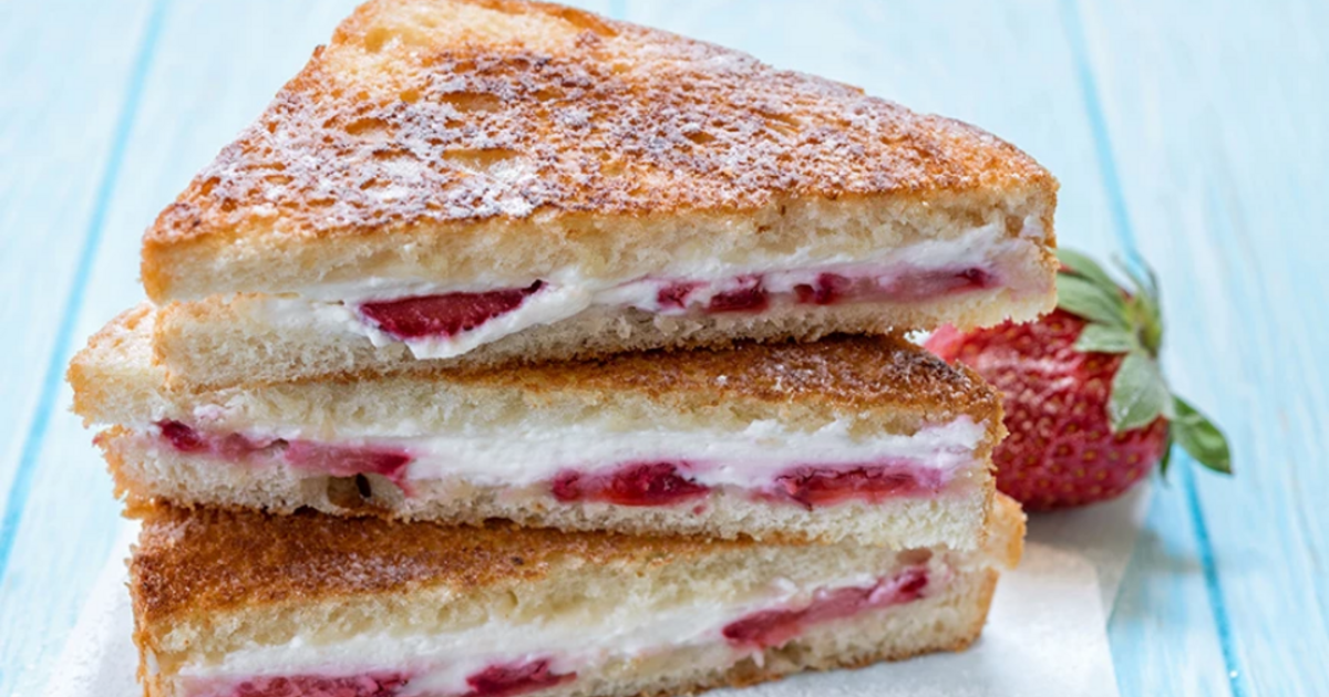 Απλώστε μια μεγάλη κουταλιά από το μείγμα στο κέντρο σε δύο φέτες ψωμιού, τοποθετήστε από πάνω τις φράουλες και καλύψτε με τις άλλες δύο φέτες ψωμιού για να φτιάξετε δύο «σάντουιτς».