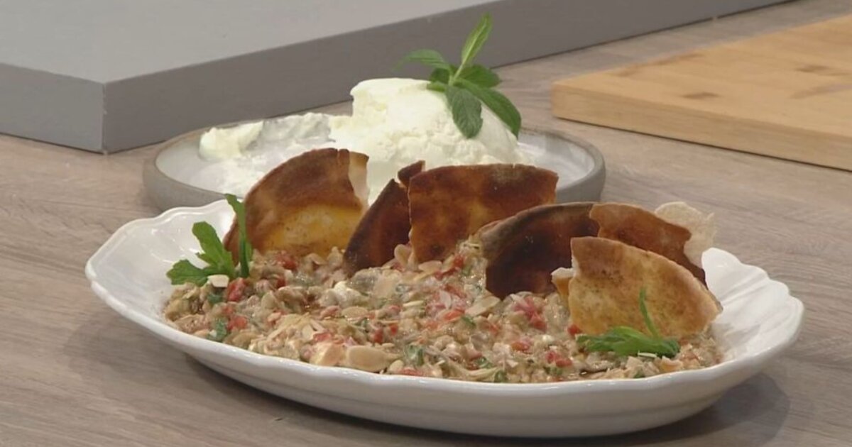 Καπνιστή μελιτζανοσαλάτα με ξύγαλο Σητείας