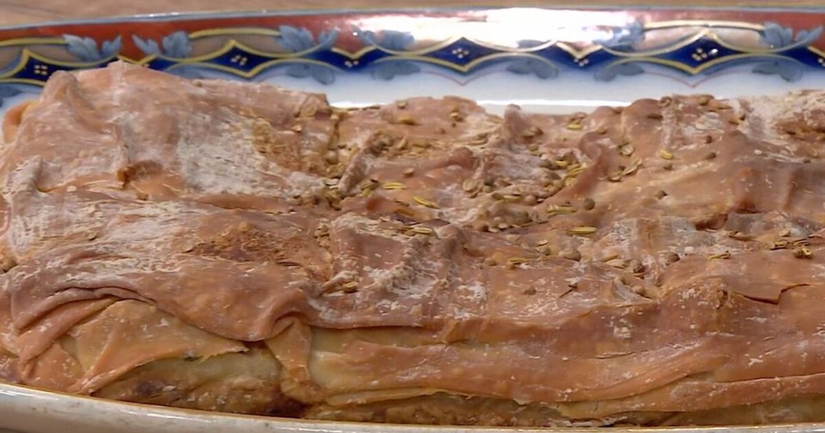 Για τη γέμιση: 100ml ελαιόλαδο 800γρ. αρνί μπούτι, κομμένο σε κομμάτια 1 ξερό κρεμμύδι, ψιλοκομμένο 1 πράσο 4 κρεμμυδάκια φρέσκα 2 κ.σ. μαϊντανός 2 κ.σ. άνηθος 1 κ.γ. ανθός αλατιού 1/2 κ.σ. μαραθόσπορος 1/2 κ.σ. σπόροι κόλιανδρου 1/4 κ.γ. μπαχάρι τριμμένο 200ml λευκό γλυκό κρασί 1 κ.σ. βούτυρι 2 αβγά 200γρ. γιαούρτι πρόβειο 1/2 κούπα γάλα 1 - 1,5 κούπα ζωμός λαχανικών 180γρ. ρύζι 1/4 κ.γ. μαύρο πιπέρι, φρεσκοτριμμένο 4 φύλλα χωριάτικα βέργας