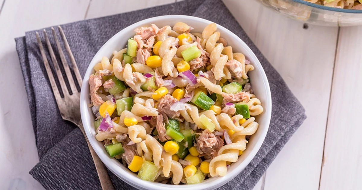 Σε ένα μεγάλο μπολ τοποθετήστε τα μακαρόνια και τον αρακά και ανακατέψτε με τα υπόλοιπα υλικά.