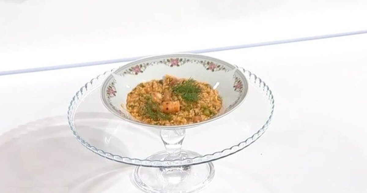 Πιλάφι με αρακά, φρέσκα κουκιά, γαρίδες και νούμπουλο
