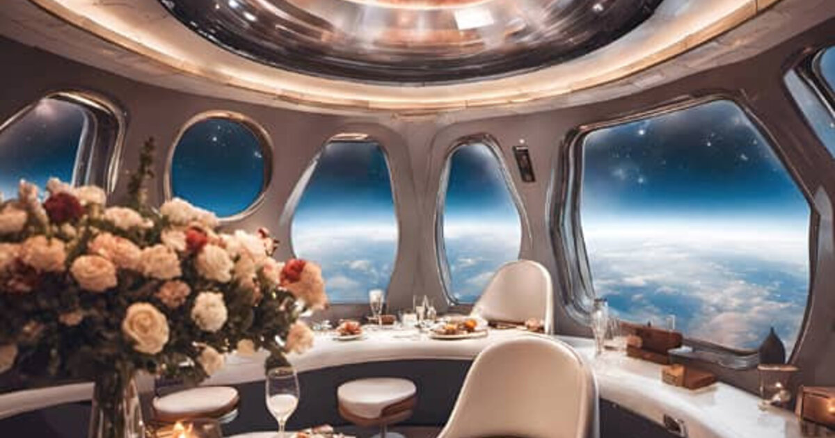 Κατά την άφιξη στον διαστημικό σταθμό, ένας πιλότος υποδέχεται το ζευγάρι και το οδηγεί σε μια σφαιρική, φουτουριστική διαστημική κάψουλα με προηγμένες ανέσεις. Στο κέντρο της καμπίνας, ένα τραπέζι είναι κομψά στρωμένο με στιλ εμπνευσμένο από τα πιο εκλεπτυσμένα παριζιάνικα εστιατόρια.