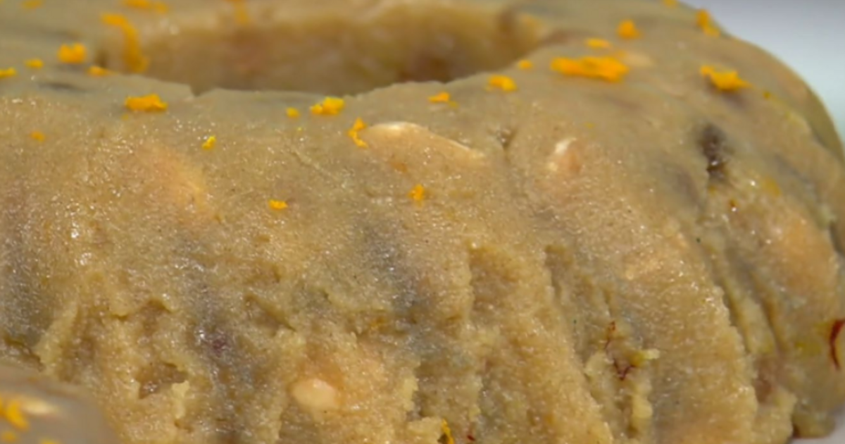 Υλικά: 1 ποτήρι ηλιέλαιο, 1 ποτήρι ψιλό σιμιγδάλι, 1 ποτήρι χοντρό σιμιγδάλι, 3 ποτήρια ζάχαρη κρυσταλλική, 4 ποτήρια ζεστό νερό, 5 γρ. κρόκο Κοζάνης, 80 γρ. σταφίδες, 100 γρ. καβουρδισμένα αμύγδαλα, 1 βανιλίνη, ½ κ.γ. κανέλα, 1 πορτοκάλι μόνο το ξύσμα.