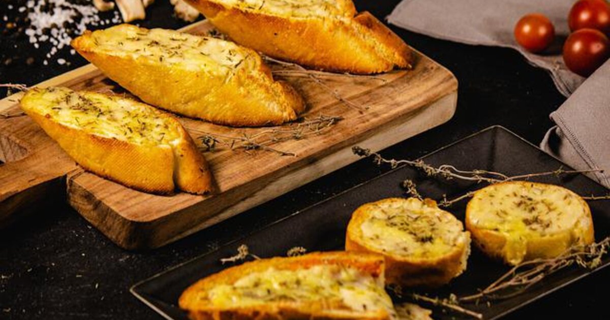 Κόψτε τη μπαγκέτα στη μέση κατά μήκος και απλώστε το μείγμα βουτύρου και τυριών ομοιόμορφα και στις δύο πλευρές της μπαγκέτας.