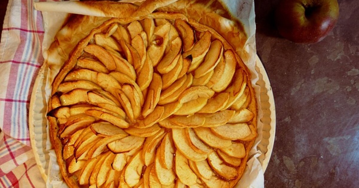 Τοποθετήστε τα μήλα έτσι ώστε να επικαλύπτονται στο κέντρο της ζύμης και ψήστε για 5 λεπτά.