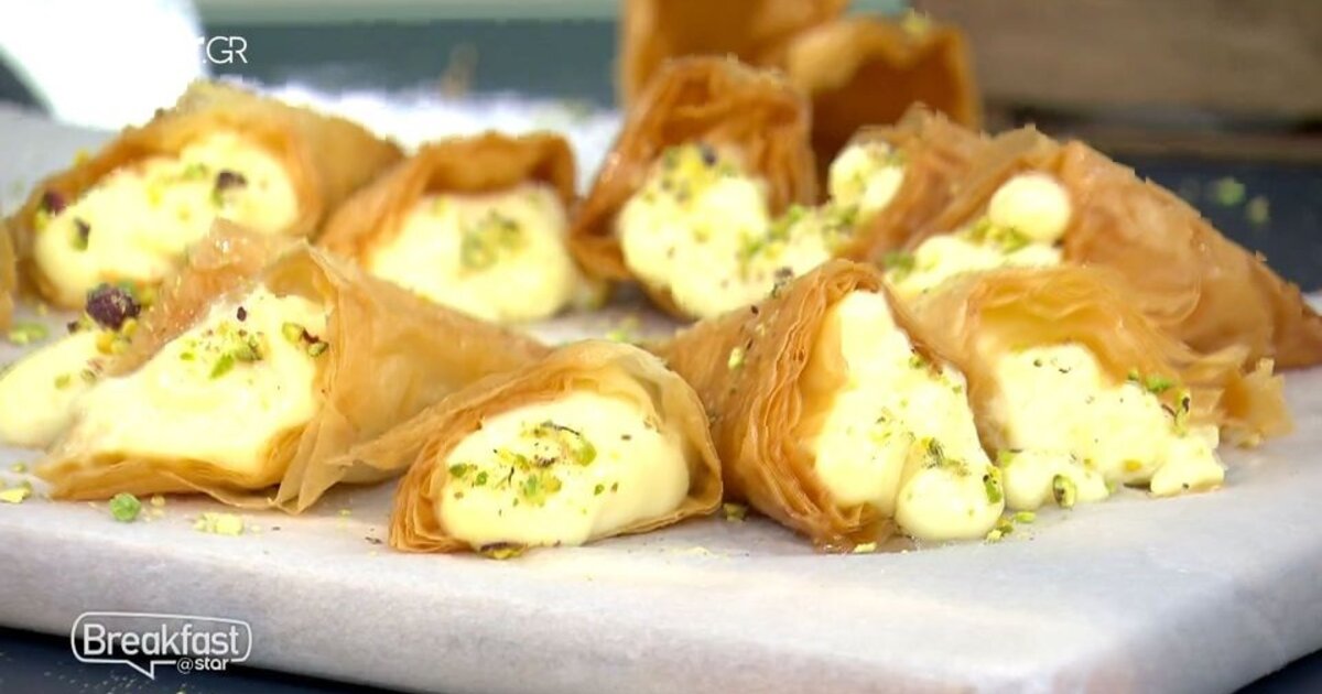 Υλικά για τη γέμιση: 1 λίτρο φρέσκο γάλα 3,5%, 200 γρ. κρυσταλλική ζάχαρη, 80 γρ. κόρν φλάουρ, 3 κρόκοι αυγών, 2 κ.σ. βούτυρο, 1 κ.γ. μαστίχα σε σκόνη, 2 βανίλιες σε σκόνη. Υλικά για το σιρόπι: 800 γρ. νερό, 650 γρ. κρυσταλλική ζάχαρη, 1 αστεροειδή γλυκάνισο, ½ λεμόνι το χυμό.