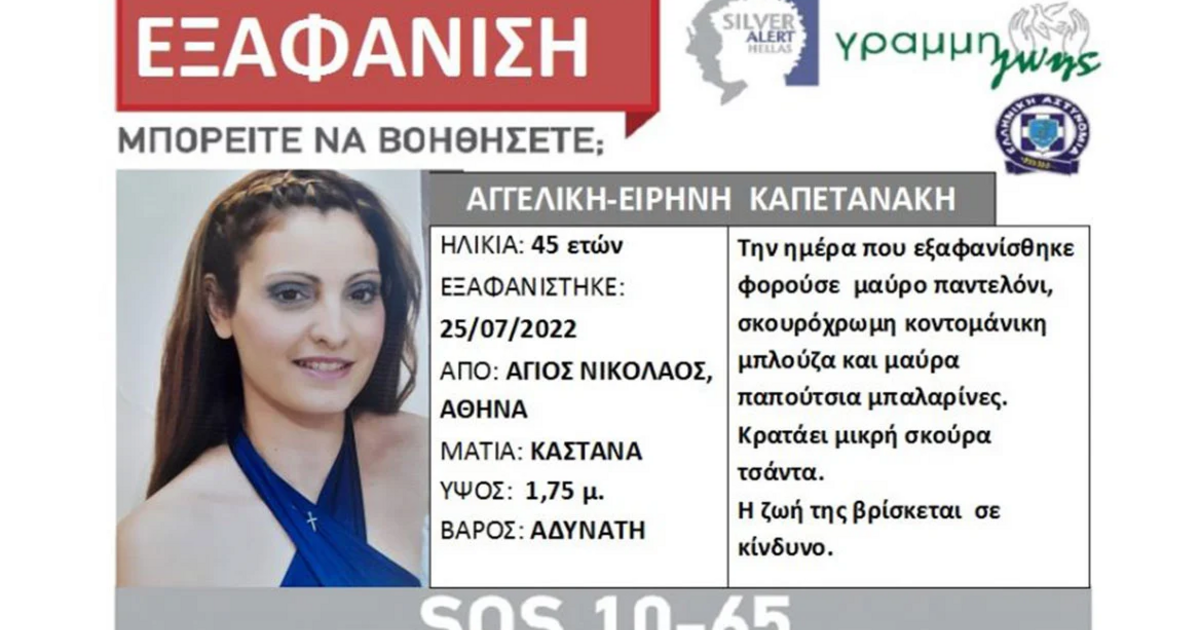 Η Αγγελική – Ειρήνη Καπετανάκη, 45 ετών, εξαφανίστηκε από το σπίτι της, στην περιοχή του Αγίου Νικολάου, στην Αθήνα, το πρωί της 25/07/2022.