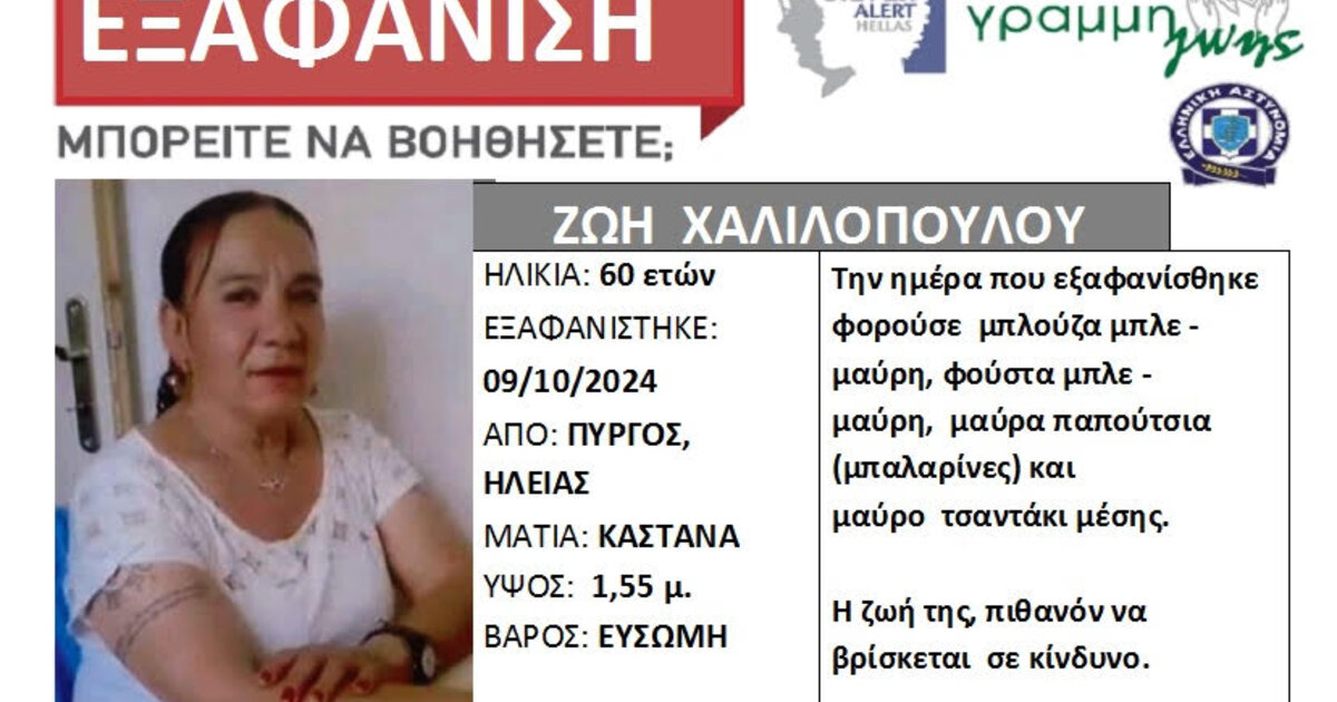 Εξαφάνιση – μυστήριο μίας γυναίκας από τον Πύργο, η ζωή της οποίας πιθανόν να βρίσκεται σε κίνδυνο και με τους δικούς της ανθρώπους να ζουν στιγμές αγωνίας.