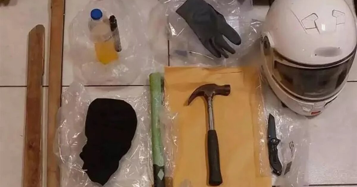 Αυτοσχέδια βόμβα μολότοφ, 2 στειλιάρια, σφυρί, αναδιπλούμενο μαχαίρι, βαριοπούλα, κράνος, κουκούλα full face,