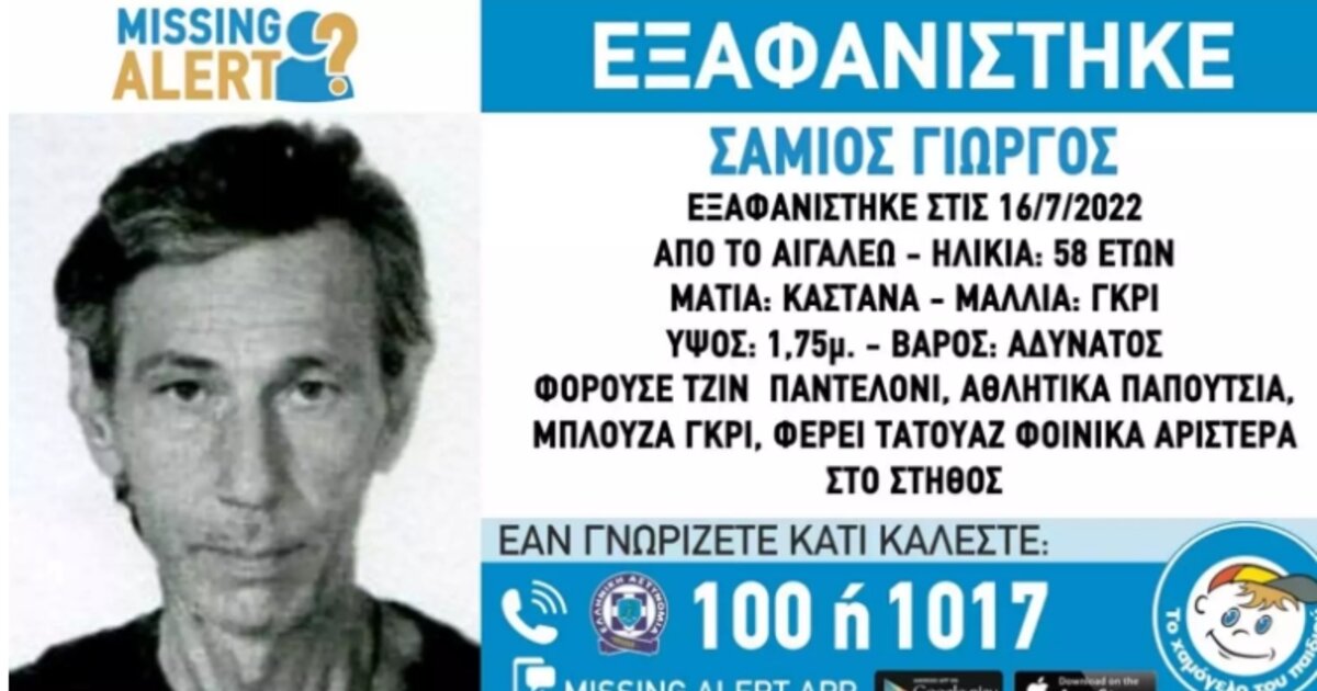 Αγνοείται εδώ και 11 ήμερες από την περιοχή του Αιγάλεω, ο Σάμιος Γεώργιος, 58 ετών, τα ίχνη του οποίου χάθηκαν στις 16.07.2022.