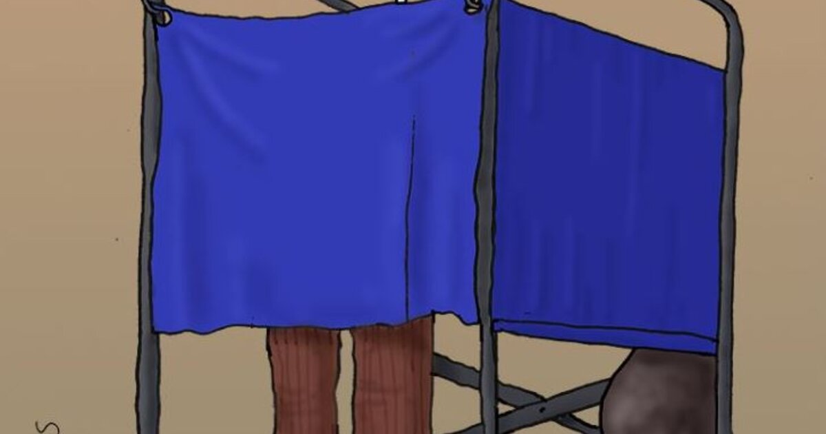 Στο σκίτσο του φαίνεται ένας ψηφοφόρος μέσα στο εκλογικό παραβάν που την ώρα που τοποθετεί το ψηφοδέλτιο της επιλογής του στο φάκελο για το ρίξει στην κάλπη σκέπτεται δυνατά και αμφισβητεί το ότι οι πολιτικοί λαμβάνουν υπόψιν τους το μήνυμα της κάλπης.