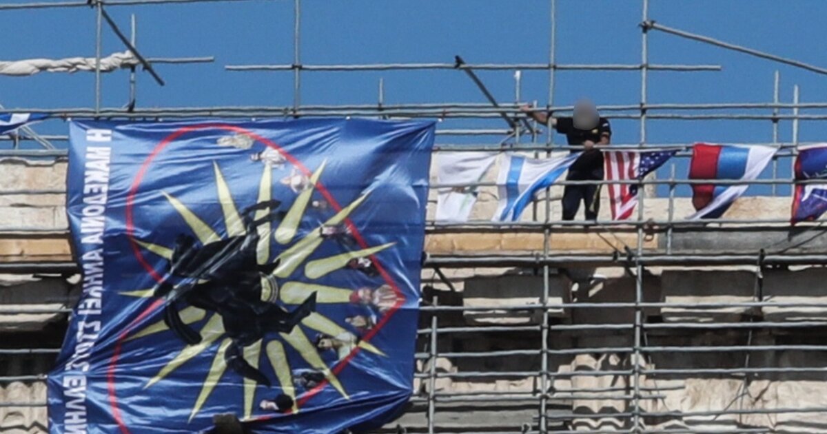 Αναστάτωση επικρατεί στην Ακρόπολη, καθώς ένας άνδρας διέφυγε της προσοχής των φυλάκων και σκαρφάλωσε στον Παρθενώνα όπου κρέμασε σημαίες του Ισραήλ, της Ελλάδας, της Νέας Δημοκρατίας αλλά και το αστέρι της Βεργίνας.