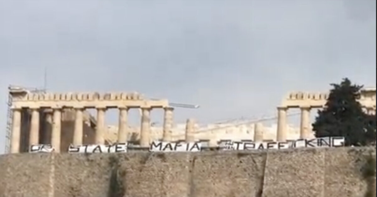 Πανό αλληλεγγύης στην Ακρόπολη ανάρτησαν διαδηλωτές από την Επιτροπή Αλληλεγγύης στη 12χρονη που έπεσε θύμα βιασμών και μαστροπείας. Το πανό έγραφε: «GR STATE MAFIA HUMAN TRAFFICKING».