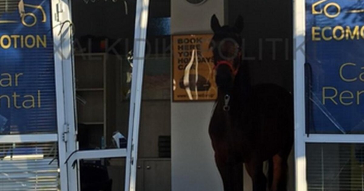 Όπως φαίνεται στις φωτογραφίες του xalkidikipolitiki.gr το άλογο έκανε γυαλιά καρφιά το κατάστημα ενοικιαζόμενων αυτοκινήτων στη Νικήτη στη Χαλκιδική και στη συνέχεια έμεινε ήρεμο στην είσοδο, απέναντι από κατοίκους της περιοχής και υπαλλήλους που πετάχτηκαν έξω έντρομοι.