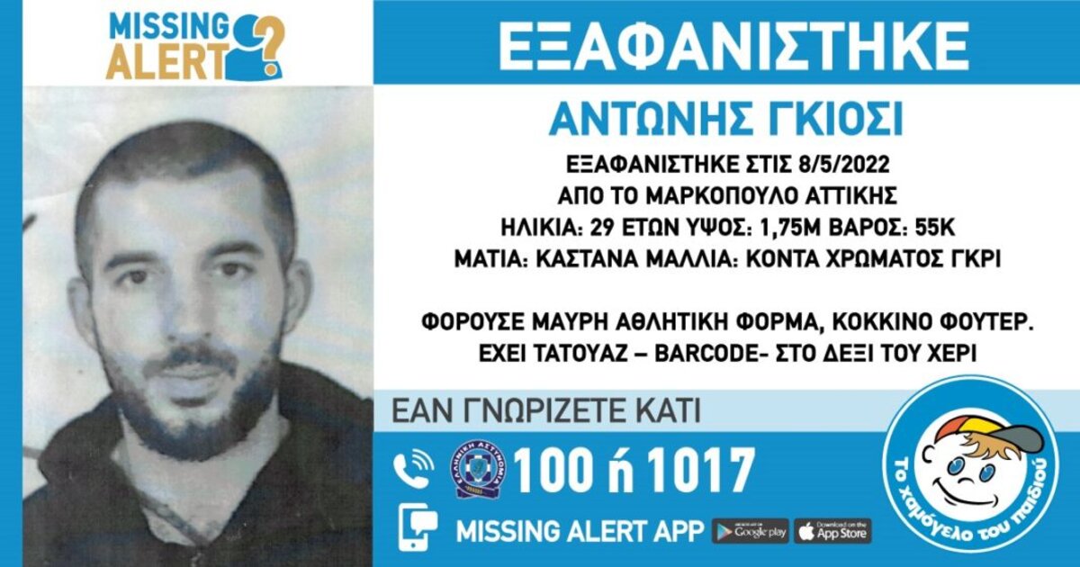 Στις 8 Μαΐου 2022 εξαφανίστηκε από την περιοχή του Μαρκόπουλου Αττικής, ο Αντώνης Γκιόσι, 29 ετών. Το «Χαμόγελο του Παιδιού» ενημερώθηκε για την εξαφάνιση του Γκιόσι Αντώνη και προχώρησε στη δημοσιοποίηση των στοιχείων του ενηλίκου κατόπιν αιτήματος της οικογένειας του, καθώς ενδέχεται να συντρέχουν λόγοι οι οποίοι θέτουν τη ζωή του σε κίνδυνο.Ο Γκιόσι Αντώνης έχει ύψος 1.75 μ., έχει 55 kg βάρος, έχει κοντά γκρι μαλλιά και καστανά μάτια. Φορούσε μαύρη αθλητική φόρμα και κόκκινο φούτερ και έχει ένα τατουάζ, barcode, στο δεξί του χέρι.