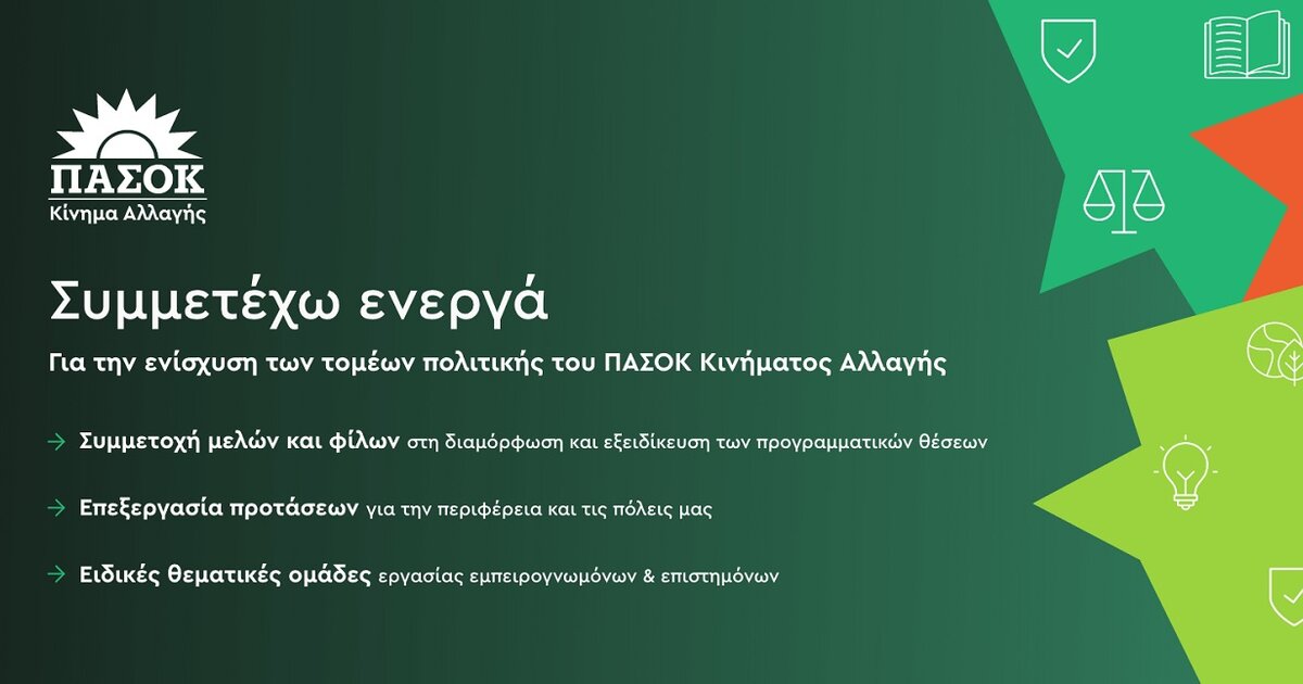 Ανοιχτό κάλεσμα συμμετοχής στους Τομείς πολιτικής και σε ειδικές ομάδες εργασίας απευθύνει το ΠΑΣΟΚ - ΚΙΝΑΛ.