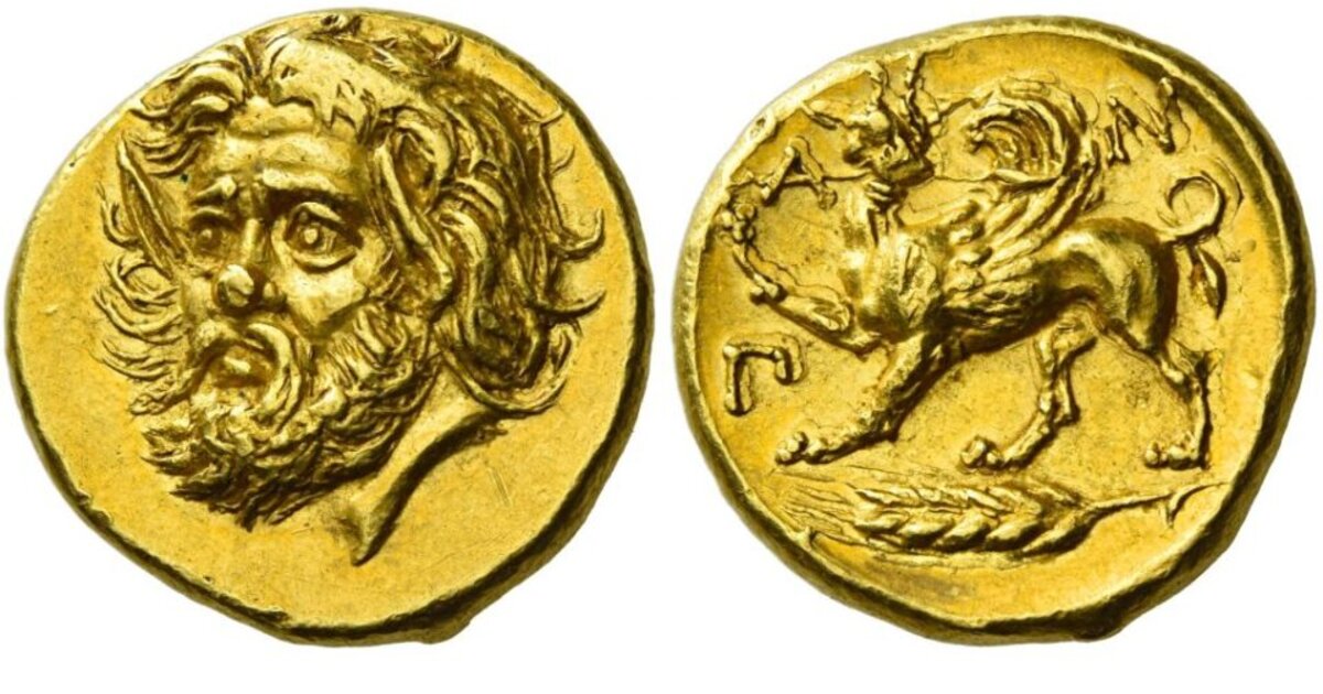Προερχόμενο από το αρχαίο Παντικάπαιον της Ταυρικής Χερσονήσου (σημερινή Κριμαία), μια ελληνική αποικία που ίδρυσαν οι Μιλήσιοι στα παράλια της Μαύρης Θάλασσας κατά τον 7ο ή 6ο αιώνα π.Χ., το χρυσό νόμισμα κόπηκε μεταξύ 340-325 π.Χ και απεικονίζει έναν ανοιχτόφθαλμο σάτυρο στην πρόσθια όψη, ενώ στην οπίσθια είναι χαραγμένος ένας γρύπας που στο ράμφος του κρατάει ένα δόρυ.