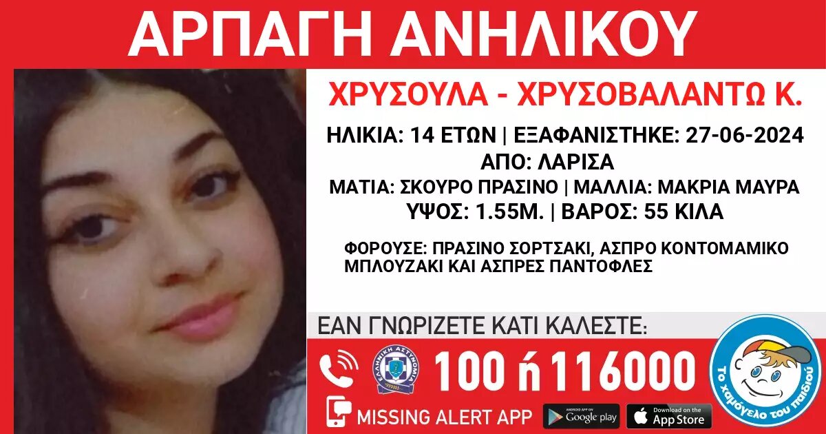 Η εξαφάνιση του κοριτσιού, με το όνομα Χρυσούλα – Χρυσοβαλάντω Κ. 14 ετών, έγινε στις 27/6/2024 από τη Λάρισα, στις 20:30. «Το χαμόγελο του Παιδιού» ενεργοποιήθηκε μία ημέρα μετά, κατόπιν εισαγγελικής εντολής….