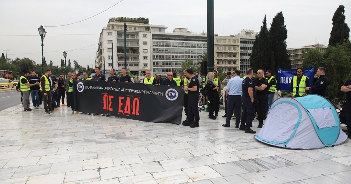 Οι αστυνομικοί, που έστησαν σκηνές στο πάνω μέρος της πλατείας, αντιδρούν σε κυβερνητική τροπολογία που κατατέθηκε τη Μεγάλη Δευτέρα, η οποία μεταξύ άλλων προβλέπει τη μείωση της αποζημίωσης για τις διανυκτερεύσεις των αστυνομικών και την υποχρεωτική μετακίνηση από την επαρχία σε Αθήνα και Θεσσαλονίκη.