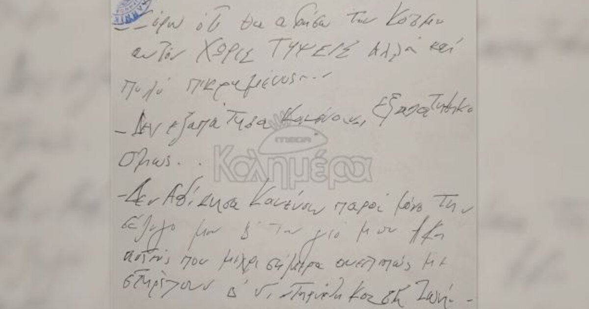 «Τα ξέρω όλα, τους γνωρίζω όλους, αλλά πάνω απ’ όλα μισώ την περίοδο 2010 – 2019. Αηδιάζω μόνο, μόνο αηδία, αηδία γιατί ξένες και ντόπιες πολιτικές δυνάμεις επιχείρησαν, στόχευσαν στην εξαθλίωση, την καταστροφή μας. Ξέρω ότι θα αφήσω αυτόν τον κόσμο χωρίς τύψεις αλλά πολύ πικραμένος. Δεν εξαπάτησα κανέναν αλλά εξαπατήθηκα. Δεν αδίκησα κανέναν παρά μόνο τη σύζυγό μου και τον γιο μου», αναφέρει το απόσπασμα που εξασφάλισε το «MEGA Καλημέρα».
