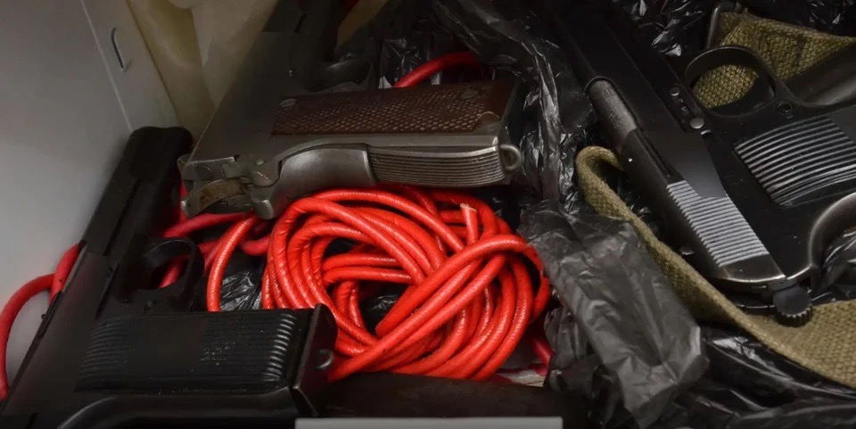 - 6 πυροβόλα όπλα, διάφορα μέρη όπλων, γεμιστήρες και πλήθος φυσιγγίων,