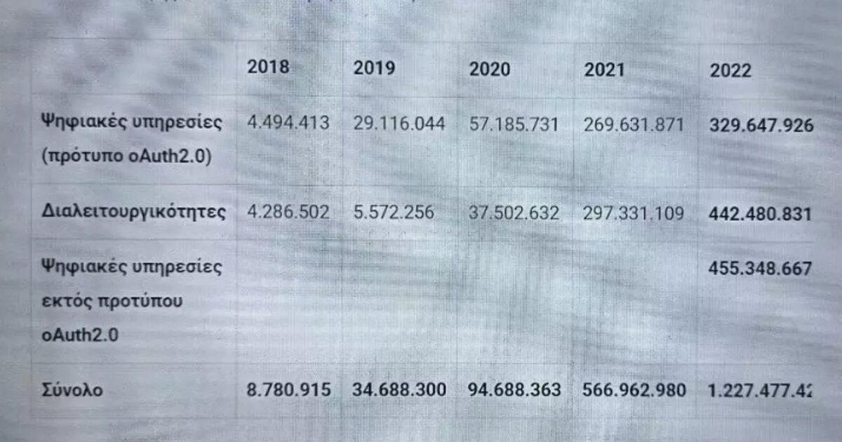 Συγκεκριμένα, από την 1η Ιανουαρίου μέχρι και την 31η Δεκεμβρίου του περασμένου έτους, τα συστήματα του Δημοσίου είτε παρείχαν ψηφιακές υπηρεσίες προς τους πολίτες, είτε «μίλησαν μεταξύ τους» 772.128.757 φορές, καταγράφοντας αύξηση άνω του 35% σε σχέση με το 2021. Ειδικότερα, οι ψηφιακές συναλλαγές των προηγούμενων ετών ανέρχονται σε: