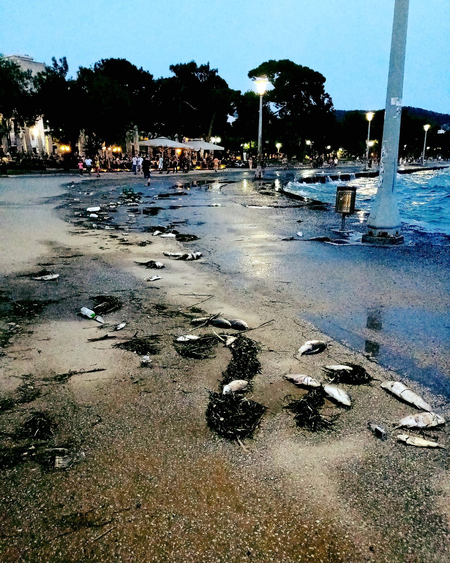 Τα νεκρά ψάρια έμειναν παρατημένα στην παραλία, όπως αναφέρουν τα gegonotanews. Πολίτες και ιδιοκτήτες καταστημάτων, μπροστά στην παραλία, είπαν στην ίδια πηγή ότι η εικόνα και η μυρωδιά είναι τόσο τραγική που ο κόσμος προτιμούσε να μην καθίσει στα τραπέζια τους, ενώ πολλοί θαμώνες που είχαν ήδη καθίσει, επέλεξαν να φύγουν.