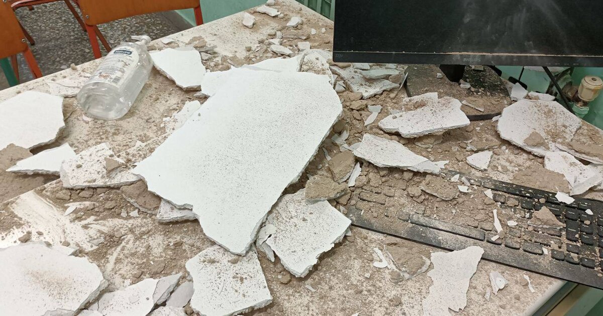 Μέρος του ταβανιού αποκολλήθηκε και έπεσε πάνω στο γραφείο και τα θρανία, προκαλώντας εύλογα τον τρόμο.