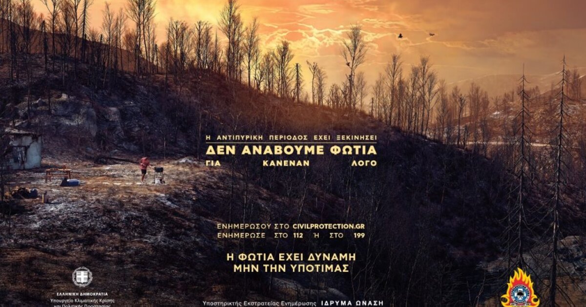 Με κεντρικό σύνθημα «Δεν ανάβουμε φωτιά για κανέναν λόγο», το υπουργείο Κλιματικής Κρίσης και Πολιτικής Προστασίας και το Πυροσβεστικό Σώμα παρουσιάζουν τα νέα τους ενημερωτικά spot (τηλεοπτικά και ραδιοφωνικά), στο πλαίσιο καμπάνιας ενημέρωσης και ευαισθητοποίησης που πραγματοποιείται με την ευγενική υποστήριξη του Ιδρύματος Ωνάση.