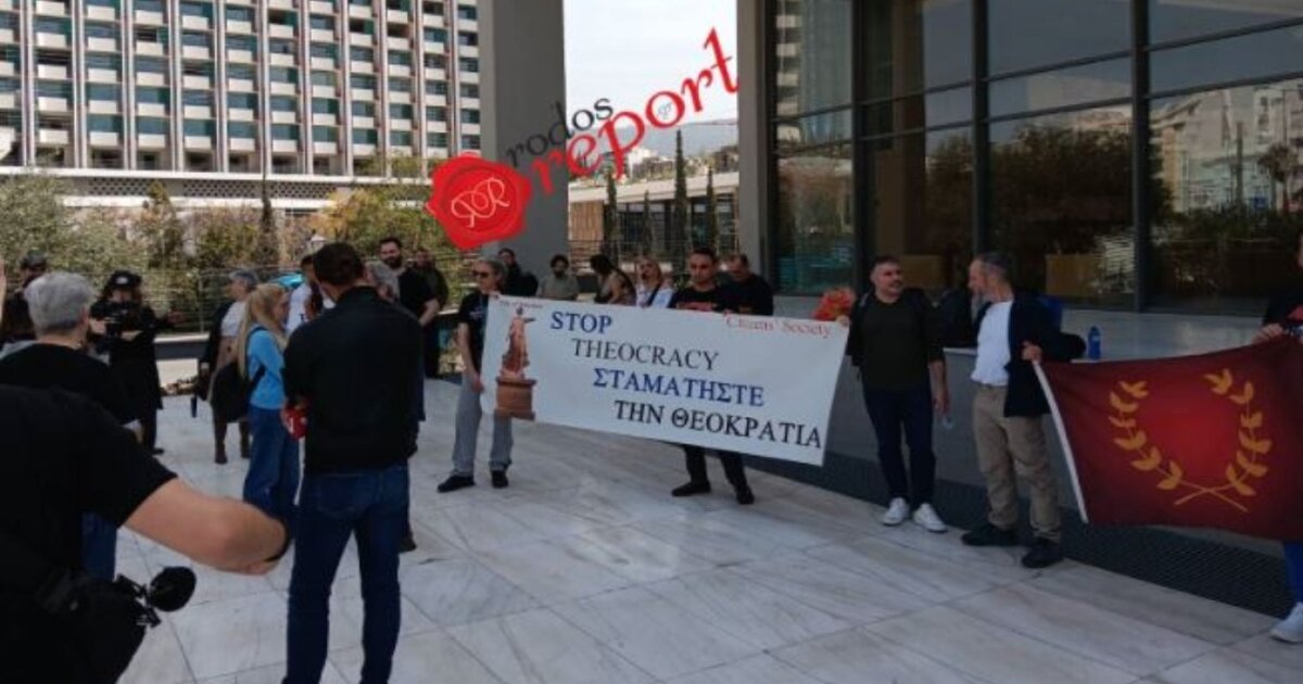 Όπως αναφέρει το rodosreport.gr, οι διαμαρτυρόμενοι είχαν συγκεντρωθεί έξω από τον χώρο της Πινακοθήκης και κρατούσαν πανό με το σύνθημα «Σταματήστε τη Θεοκρατία».