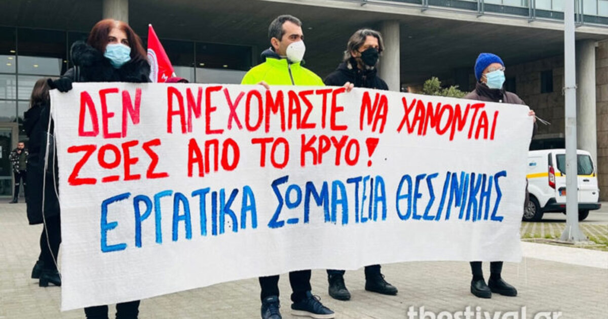 Παράσταση διαμαρτυρίας έξω από το δημαρχείο Θεσσαλονίκης πραγματοποίησαν μέλη εργατικών σωματείων, με αφορμή τον θάνατο ενός 60χρονου άστεγου, προχθές, στην πλατεία Αριστοτέλους.