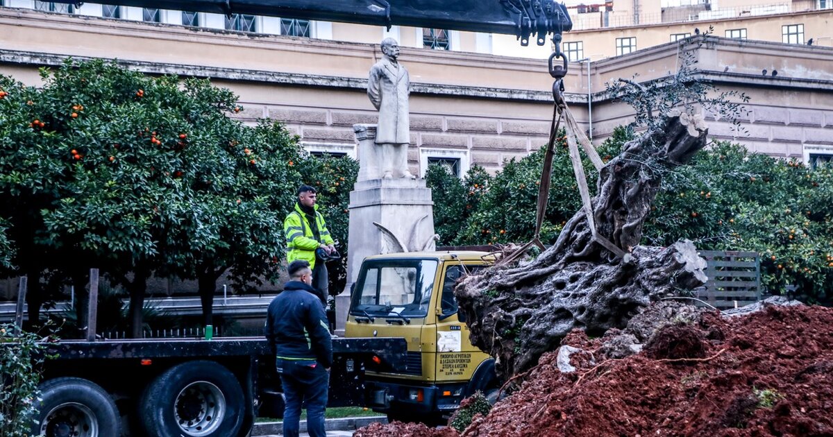 Μια ελιά 700 ετών, διασώθηκε και μεταφυτεύτηκε από τον Δήμο Αθηναίων, μπροστά από τη Παλαιά Βουλή.