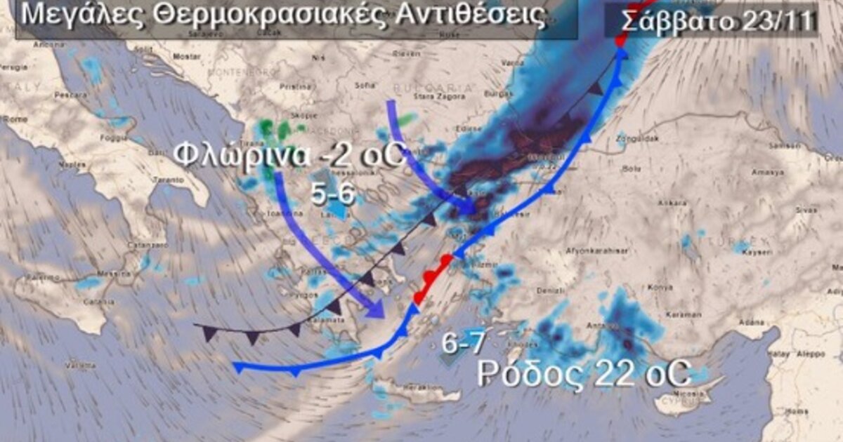 Τις πρωινές ώρες του Σαββάτου πολλοί θα εκπλαγούν από τις μεγάλες αντιθέσεις της θερμοκρασίας, μεταξύ βορά και νότου, όπου οι ΝΔ άνεμοι στη Ρόδο θα διατηρούν τον υδράργυρο περί τους 22°C, ενώ στη Φλώρινα όπου θα έχει ήδη επικρατήσει βοριάς και θα χιονίζει κατά διαστήματα, η θερμοκρασία θα βρίσκεται υπό το μηδέν, μόλις στους -2°C. Αυτές οι μεγάλες θερμοκρασιακές διαφορές , της τάξεως των 20°C και πάνω, εμφανίζονται πολύ συχνά- σχεδόν πάντοτε - με τις διελεύσεις Βαλκανικών μετώπων .