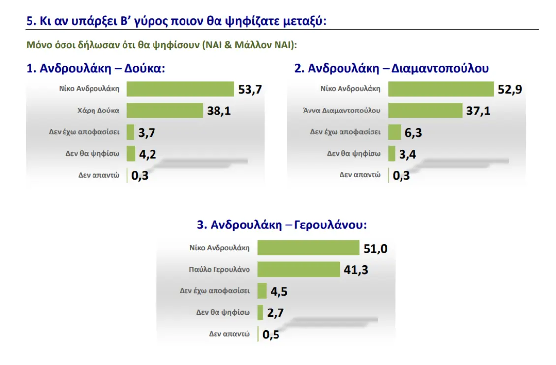 Στις πιθανές διασταυρώσεις του Β’ γύρου ο κ. Ανδρουλάκης αναδεικνύεται νικητής, αυτή η συζήτηση όμως είναι κάπως προωθημένη καθώς το αποτέλεσμα της πρώτης Κυριακής θα διαμορφώσει νέες δυναμικές και θα τοποθετήσει το πολιτικό δίλλημα σε νέα βάση.